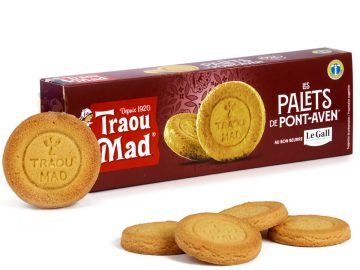 Le palet breton est un biscuit tout rond et bien sablé qui est arrivé juste après les galettes en 1920 par Alexis le Villain. Inspiré du jeu de palet breton, palet en fonte lancé sur une planche en bois, ce sablé pur beurre se reconnait aisément par sa texture plus épaisse d’environ 1.5 cm de hauteur et n’est pas doré à l’oeuf contrairement à sa cousine galette et est encore plus généreux en beurre salé !