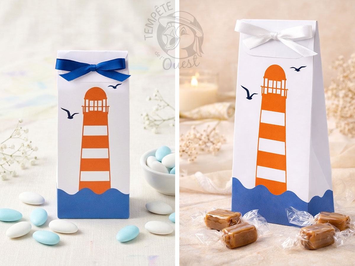 Si votre cérémonie, mariage, baptême, anniversaire ou encore communion porte sur le thème de la mer ou de la Bretagne, alors transportez vos convives d’un jour dans le fabuleux monde marin en leur offrant pour présent cette jolie boîte à dragée phare breton, joliment décorée d’un phare rouge immergé dans l’océan et entouré de mouettes. Cet étui à dragées, entièrement confectionné en France avec une impression de qualité supérieure, pourra accueillir dragées ou caramels au beurre salé et autres douceurs, à refermer avec du ruban ou de la cordelette (non inclus).