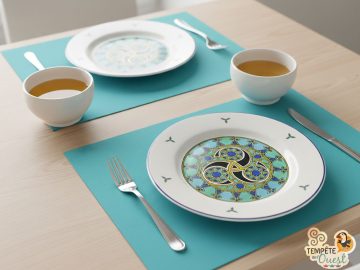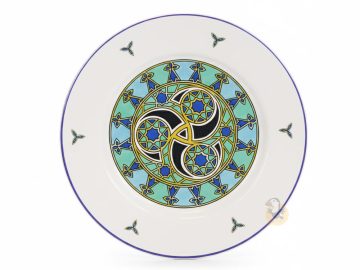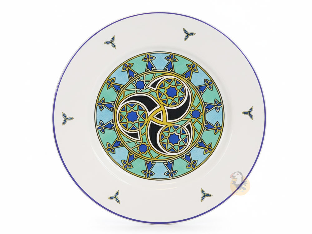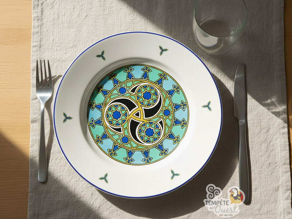 Élégante et profondément bretonne, cette assiette bretonne décorée d’un triskell central entouré d’un motif façon mosaïque apporte une vraie identité à votre table. Chaque pièce est décorée à la Faïencerie de Pornic, atelier emblématique qui perpétue depuis des décennies un savoir-faire artisanal unique. Le décor mêle bleu, vert et touches de jaune dans une composition circulaire très graphique, presque comme une petite rosace. Le résultat : une assiette au décor moderne mais à l’identité bretonne marquée ! Suffisamment raffinée pour un repas soigné, elle se prête aussi bien à une utilisation quotidienne qu’à un joli service pour recevoir.