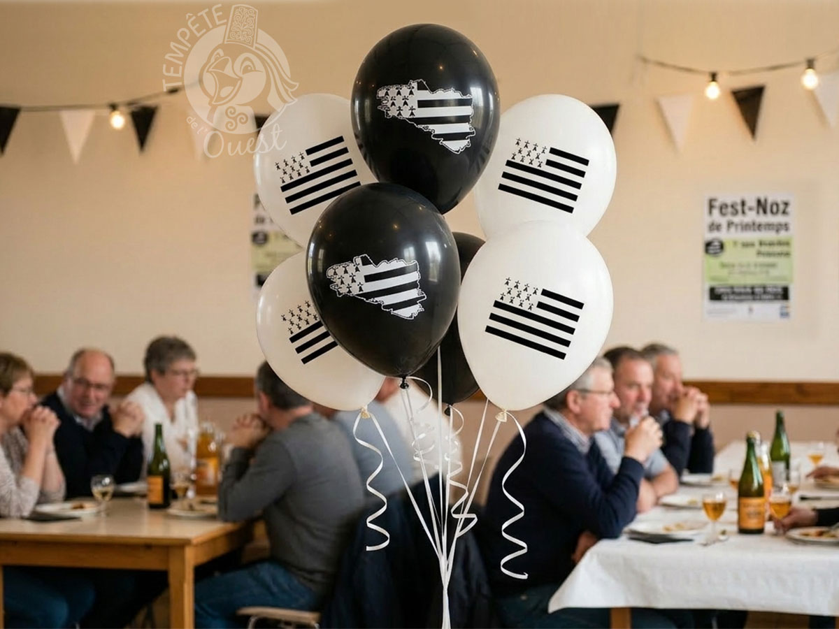 Avec leur design noir et blanc inspiré du drapeau breton, ils s’intègrent parfaitement dans une décoration festive aux couleurs de la Bretagne et attirent immédiatement l’œil. Accessibles et visuellement impactants, ces ballons sont la clé pour un effet remarquable à moindre coût, que ce soit pour un événement privé ou professionnel.