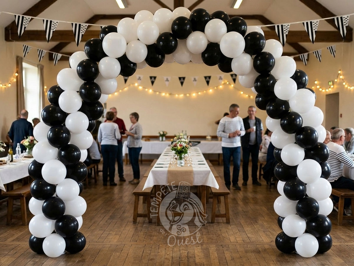 Le contraste noir et blanc offre un rendu visuel à la fois sobre et impactant. Ces ballons constituent également une excellente base de décoration pour une ambiance bretonne : ils peuvent être associés à nos ballons drapeau breton ou à nos ballons carte de Bretagne, afin de créer une composition encore plus évocatrice de la région !