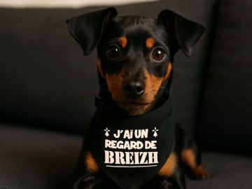 Pour que votre fidèle compagnon soit à la pointe de la mode bretonne, rien de mieux nos bandanas pour chien “Doggy Breizh” ! Aux couleurs noires et blanches de la Bretagne, ils sont illustrés avec 4 phrases différentes (“J’aime ma maîtresse”, “J’ai un regard de Breizh”, “Petit mais breton“, “Attention chien breton !”). Disposant d’un trou à chaque extrémité, vous pourrez ainsi le glisser tout simplement dans le collier de votre chien qui sera paré pour une bonne balade avec un look breton absolument ravissant !