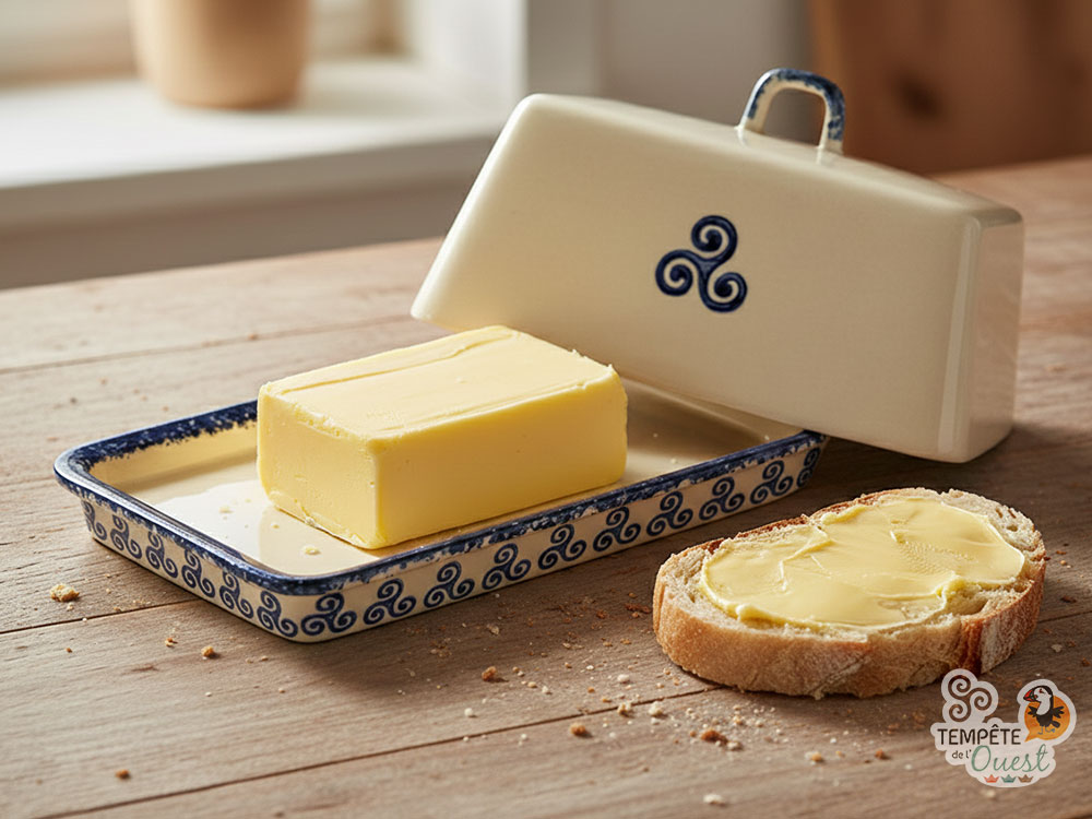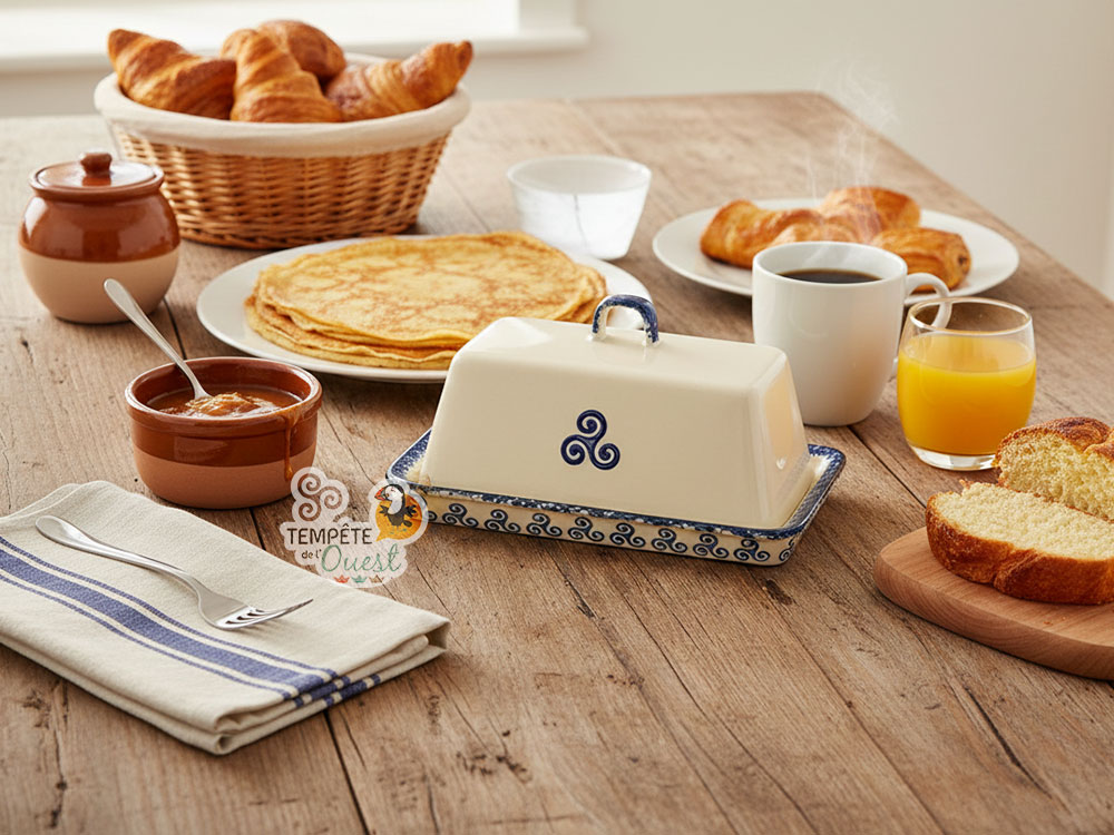 Ce grand beurrier traditionnel beige et bleu, orné d’une frise de triskell partout autour du socle et d’un triskell peint sur le couvercle de chaque côté et à l’intérieur, ainsi que d’un liseré moucheté à l’ancienne, sera idéal pour conserver votre plaquette de beurre à l’abri de l’humidité et des odeurs du frigo, tout en étant pratique pour le service à table ! Disposant d’un grand volume, il conviendra aussi pour les plaquettes de beurre de 500 grammes.