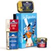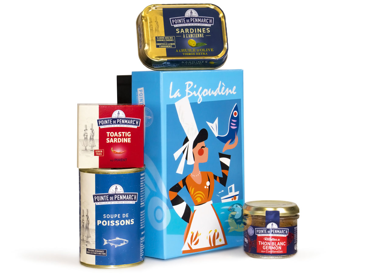| Ingrédients | Sardines à l’ancienne à l’huile d’olive : sardines, huile d’olive vierge extra, sel Tartinable de sardines au piment “Toastig” : sardines (38.5%), maquereaux, huile de tournesol, concentré de tomate (12.5%), eau, farine de riz, moutarde de Dijon (eau, graines de moutarde, vinaigre d’alcool, vin blanc (sulfites), sel, acidifiant: acide citrique), sel, poivre, piment de Cayenne (0.1%). Soupe de poissons : Eau, poissons 33 % (parures de poissons frais débarqués dans les ports bretons, sardines), carotte, concentré de tomate, crabe vert, pomme de terre, oignon, poireau, sel, huile de colza, ail, safran, fenouil, curcuma, basilic, piment, paprika, poivre, thym, laurier. Rillettes de thon blanc germon aux confiterelles (tomates séchées) : thon blanc germon (50%), eau, huile de tournesol, tomates séchées (5%), concentré de tomates, oignons. |