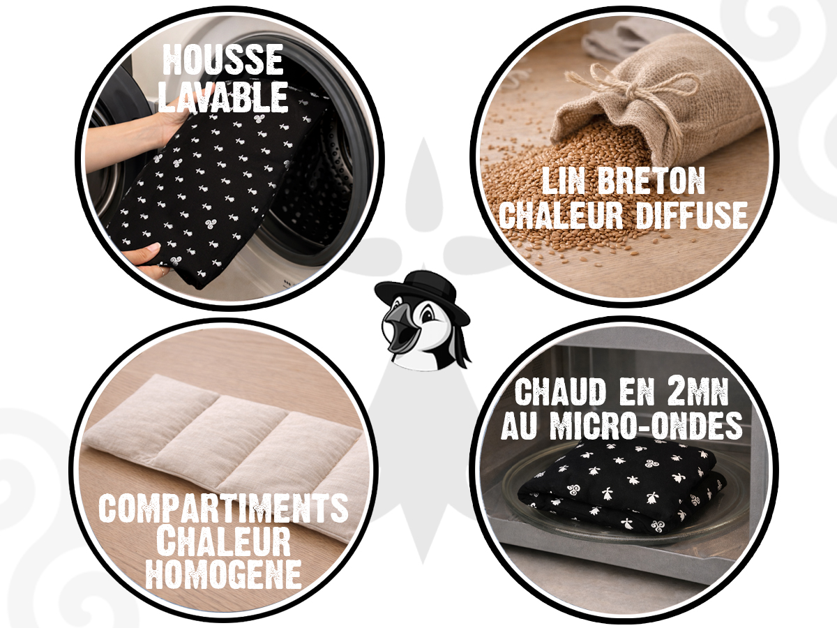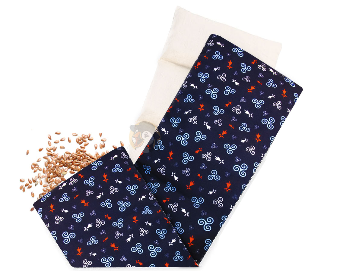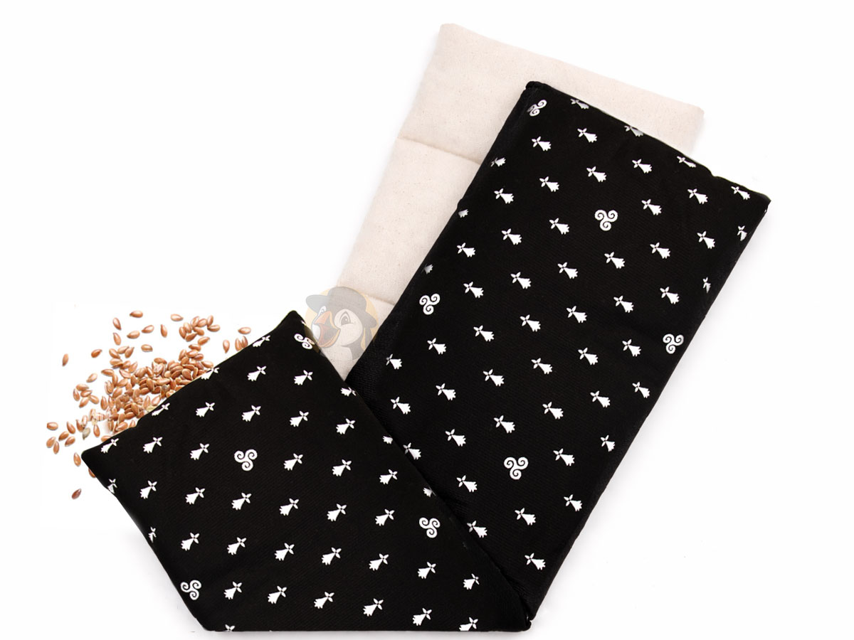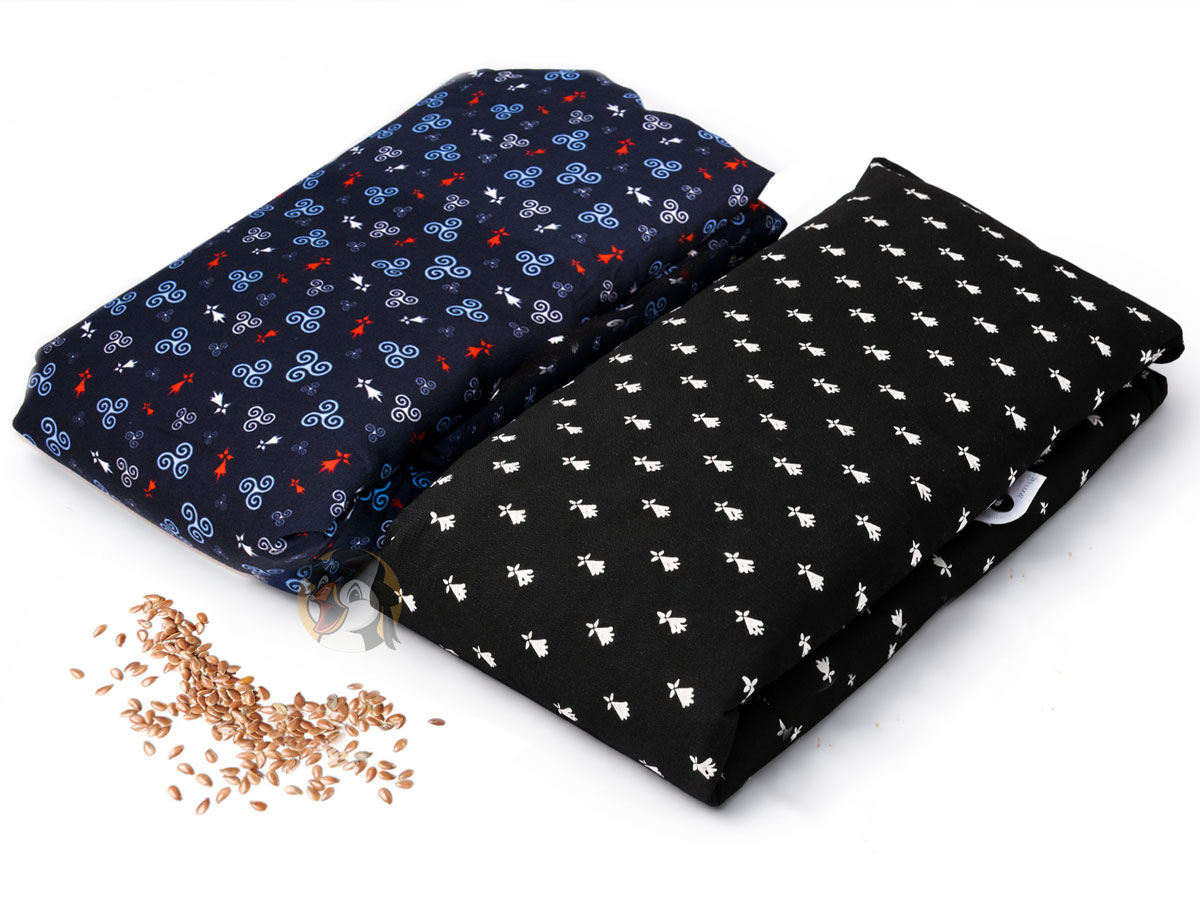 Cette magnifique bouillotte sèche 100% bretonne et artisanale, de sa conception à la main, à ses motifs bretons (triskells et hermines) jusqu’à son garnissage à base de graines de lin originaires de Bretagne, sélectionnées pour leur capacité naturelle à emmagasiner et restituer la chaleur de façon progressive, vous réchauffera et fera la joie des frileux et frileuses et soulagera aussi vos petits maux du quotidien.
