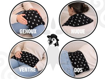 Sa forme allongée est idéale pour la positionner autour du cou en tant que bouillotte cervicale ou aussi pour apaiser les douleurs lombaires dans le bas du dos, les maux de ventre ou encore une douleur au genou. Elle se distingue aussi par sa structure compartimentée : les sections cousues permettent une répartition homogène de la chaleur, évitant que les graines ne se déplacent ou ne s’accumulent d’un côté. Résultat : une sensation de confort plus stable et mieux maîtrisée, quelle que soit la zone d’utilisation.