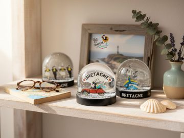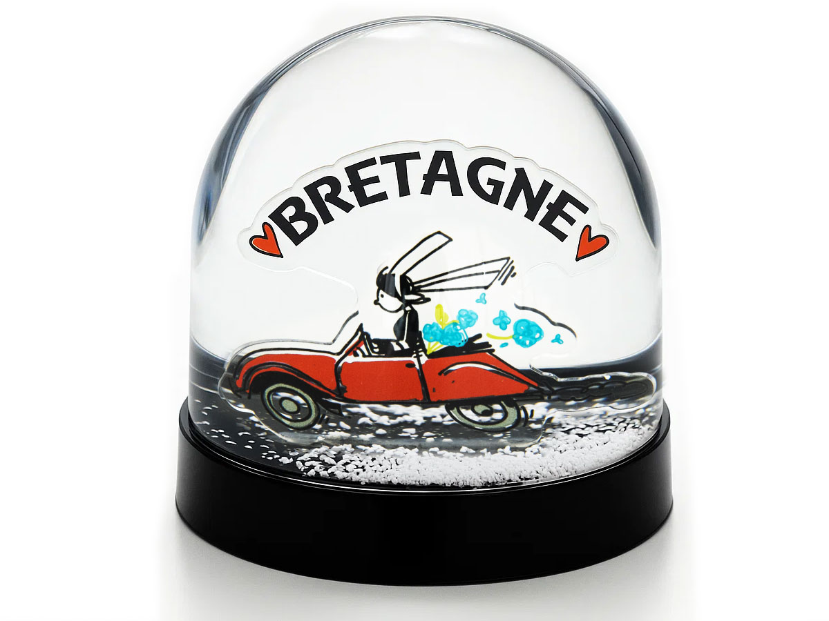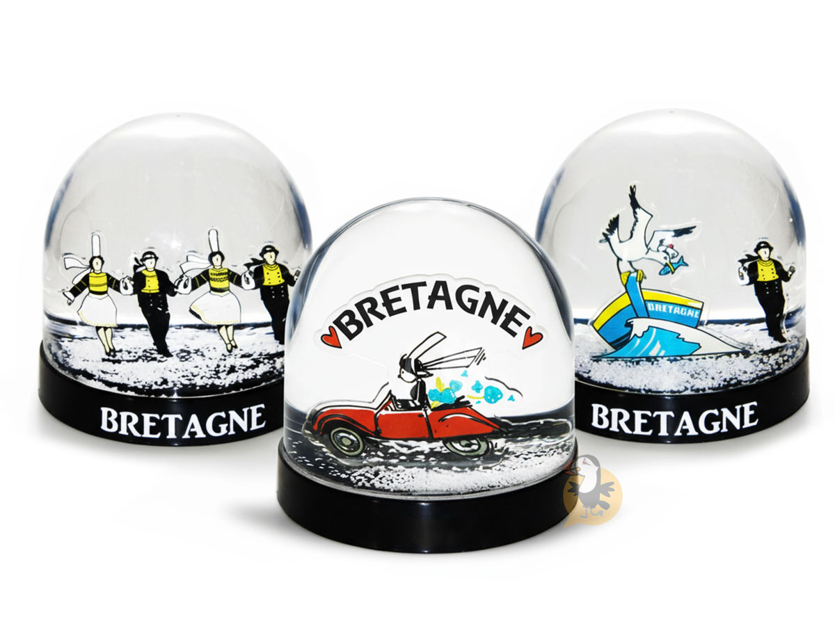 Objet de décoration rétro intemporel de notre enfance, découvrez nos trois modèles de boules à neige bretonnes et laissez-vous vous apaiser à contempler ses flocons de neige en la secouant ! Confectionnée en plastique, avec l’inscription “Bretagne” à l’avant (sauf le modèle 2CV dont le mot est incrusté dans la boule), 3 décors vous sont proposés : le goéland sur son bateau de pêche ou le bagad avec ses 4 bretons et bretonnes dansant la gavotte, ou la bigoudène au volant de sa 2CV.