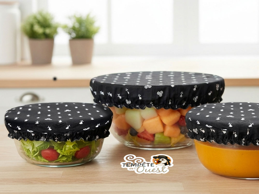 Ce lot de 3 charlottes alimentaires de diamètres différents, lavables et réutilisables à l’infini, vous permettront de recouvrir vos saladiers, plats, bols et casseroles, pour conserver vos aliments au réfrigérateur ou les protéger des mouches et insectes indésirables à l’extérieur. Fini le film alimentaire et papier aluminium, faites des économies sur le long terme et optez pour une cuisine zéro déchet ! Elastiques et adaptables à une grande variété de tailles et formes de plats (carrés, ovales, etc.), elles sont parfaitement conçues pour ne pas étouffer les aliments et les protéger de l’humidité. Ce trio de couvre-plats bretons a été élaboré avec du tissu noir de qualité de 150g/m² en coton enduit certifié Oeko-tex revêtu de motifs bretons imprimés (triskell et hermines) et une doublure blanche à l’intérieur en tissu PUL Kleen alimentaire déperlant et imperméable certifié contact alimentaire.