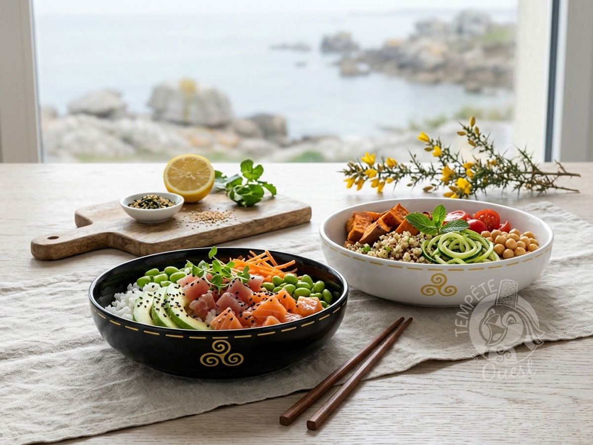 Sublimez vos compositions culinaires avec ce duo d’assiettes creuses / poke bowls Iroise, une alliance parfaite entre modernité et héritage celte. Ce coffret cadeau réunit deux pièces de caractère façonnées en grès, l’une habillée d’un noir intense et l’autre d’un blanc lumineux. Le contraste est magnifié par une finition brillante qui fait ressortir le décor jaune safran, dont le triskell et la frise géométrique semblent délicatement incrustés dans la matière pour un rendu mat et texturé au toucher.