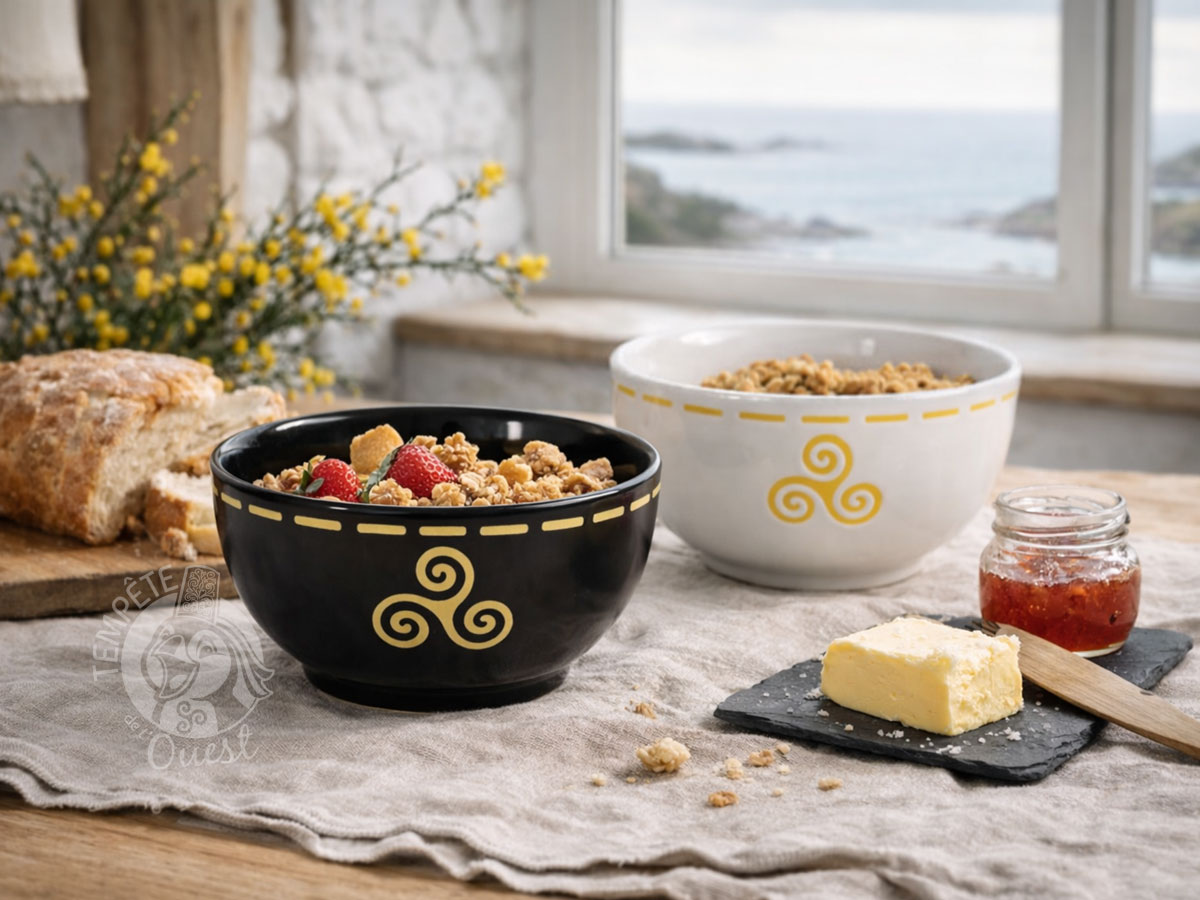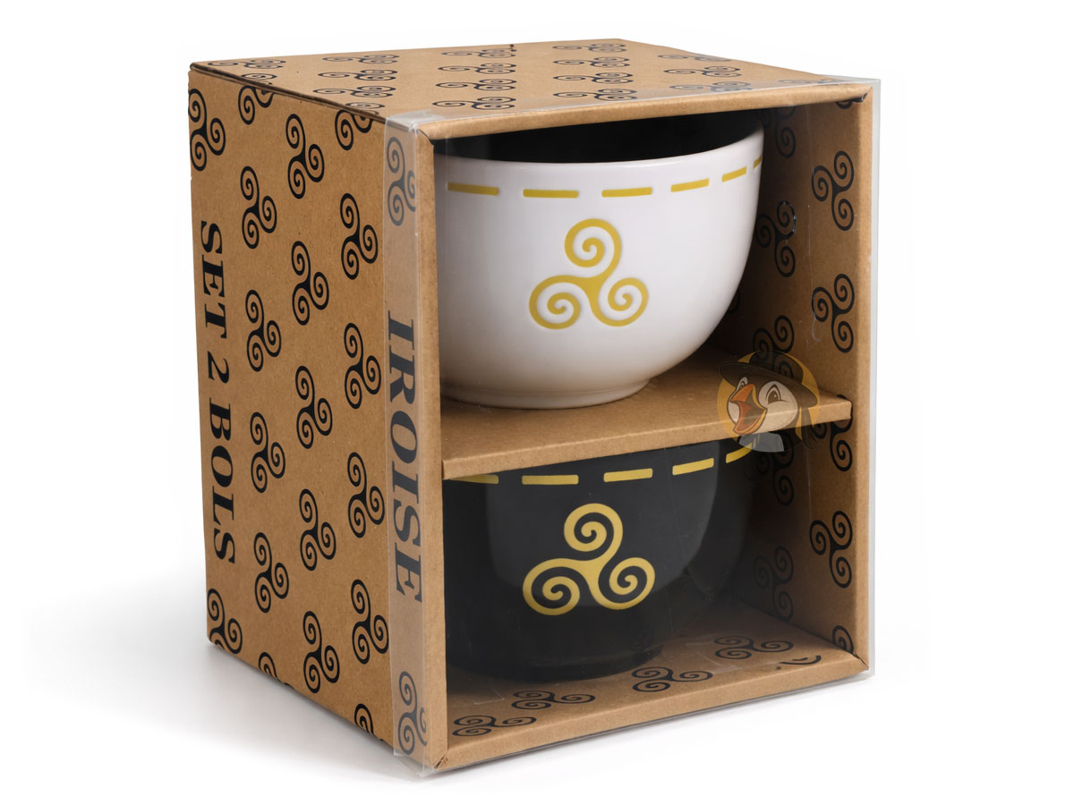 Apportez une touche d’élégance bretonne à vos instants gourmands avec ce duo de bols bretons Iroise, entre sobriété et caractère. Ce coffret exclusif réunit deux pièces complémentaires en grès : l’une d’un noir profond et l’autre d’un blanc pur, toutes deux sublimées par un aspect brillant et un joli contraste avec le décor mat jaune incrusté représentant l’iconique triskell celte.