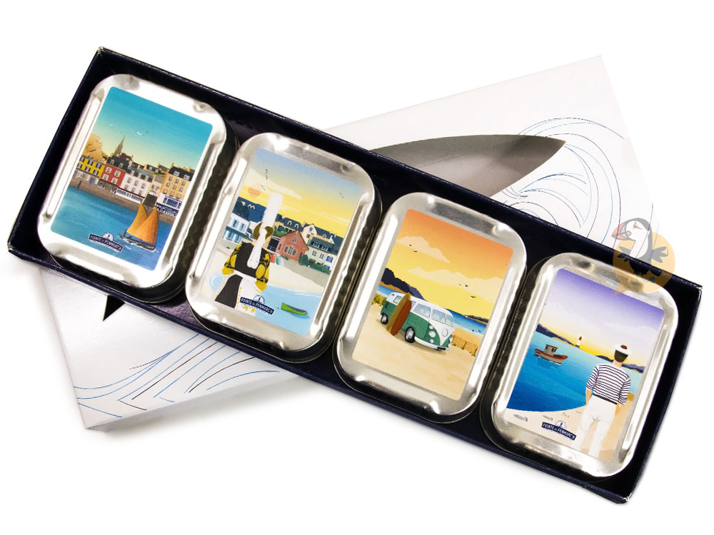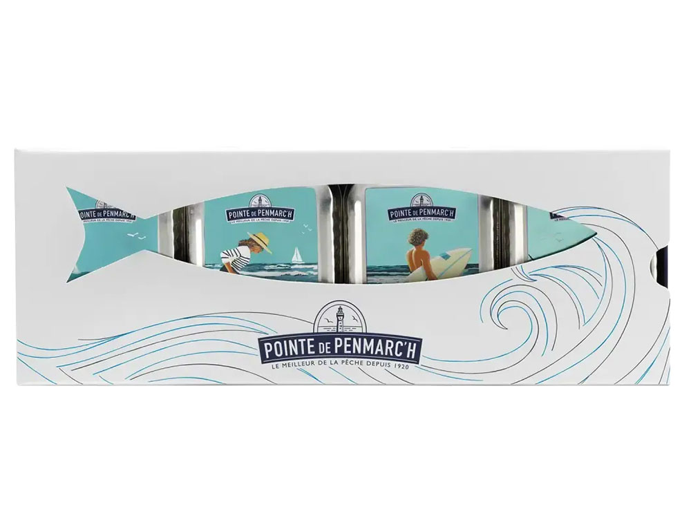 Telle une œuvre d’art, ce superbe coffret de sardines La Pointe de Penmarc’h renferme 4 boîtes de sardines traditionnelles illustrées aux accents rétro et marins. Emboîtées fraîches à Douarnenez, les sardines sont présentées dans de jolies conserves décorées de scènes de bord de mer pleines de douceur et de nostalgie, avec de superbes impressions effet métallisé/chromé. Les illustrations de ces conserves bretonnes ont été créées par Sophie C., une créatrice locale installée à Pont-l’Abbé, qui puise son inspiration dans l’univers breton, les costumes de bigoudènes et le littoral. Un coffret spécial sardines aussi gourmand que décoratif et qui en mettra plein la vue à celui qui l’ouvrira !