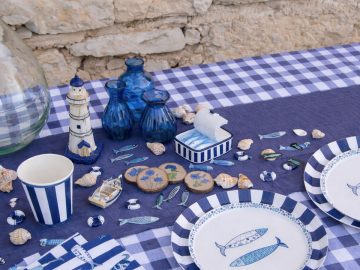 Elles s’associent parfaitement assiettes marinière, aux petites assiettes sardines, aux gobelets rayés et aux serviettes assorties et à une boîte de sardines décorative pour composer une table cohérente et très photogénique.