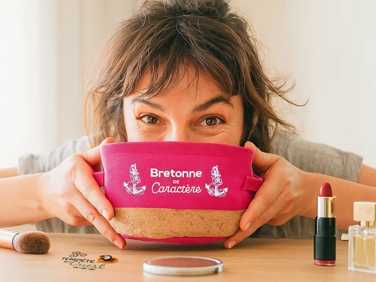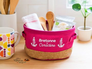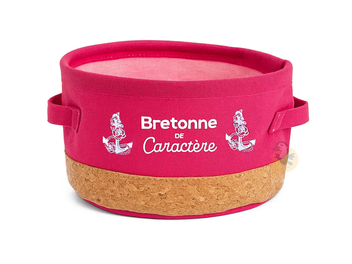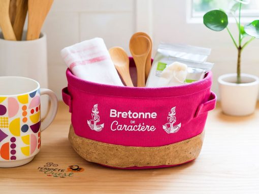 Cette petite corbeille en tissu rose fuchsia et liège porte fièrement son message : « Bretonne de caractère ». Elle s’utilisera aussi bien dans la salle de bain que sur une coiffeuse, dans une cuisine ou sur une étagère pour ranger les petits accessoires du quotidien et vous permettra de revendiquer haut et fort votre personnalité haute en couleurs ! Avec son diamètre d’environ 16 cm, elle trouvera facilement sa place partout et pourra contenir tout un tas de petites choses : pour le maquillage, cotons et démaquillants, bijoux, sachets de thé ou épices, ou même quelques bricoles que l’on aime garder à portée de main, comme un vide-poches. Le contraste du liège naturel et du tissu coloré lui donne un style à la fois doux et affirmé.