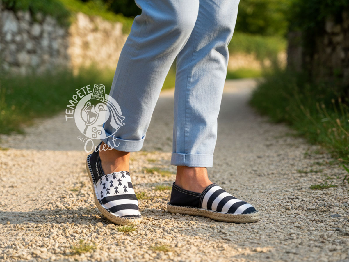 Ces espadrilles drapeau breton en toile reprennent la silhouette intemporelle de l’espadrille traditionnelle en y ajoutant une identité bretonne forte et assumée. Le motif Gwenn ha du, avec ses rayures noires et blanches et ses hermines, rappelle clairement l’attachement à la Bretagne et à sa culture. Sur le côté, l’inscription “Yec’hed mat !”, un clin d’œil convivial, simple et authentique.