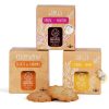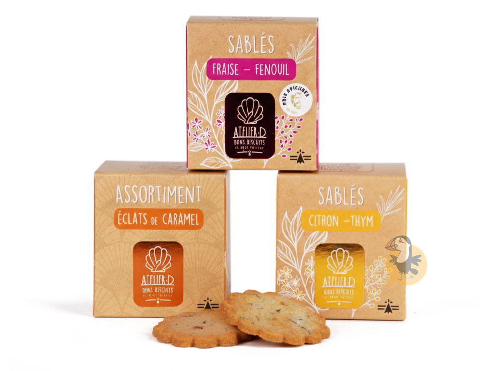 | Ingrédients | Galettes bretonnes fraise/fenouil : farine de blé, beurre fin, sucre, fraises confites (6.7%), jaunes d’œufs, fleur de sel de Guérande, arôme naturel de fraise, huile essentielle de fenouil (0.04%)*. *Ingrédients issus de l’agriculture biologique. Galettes bretonnes citron thym : farine de blé, beurre fin, sucre, jaunes d’œufs, pépites de citron (7.3%), arôme naturel de citron, thym (0.8%), fleur de sel de Guérande, arôme naturel de thym. Assortiment palets/galettes caramel : farine de blé, beurre fin, sucre, jaunes d’œufs, éclats de Salidou (6.8%) (sucre, sirop de glucose, beurre frais, sel de Guérande), fleur de sel de Guérande, levure. |