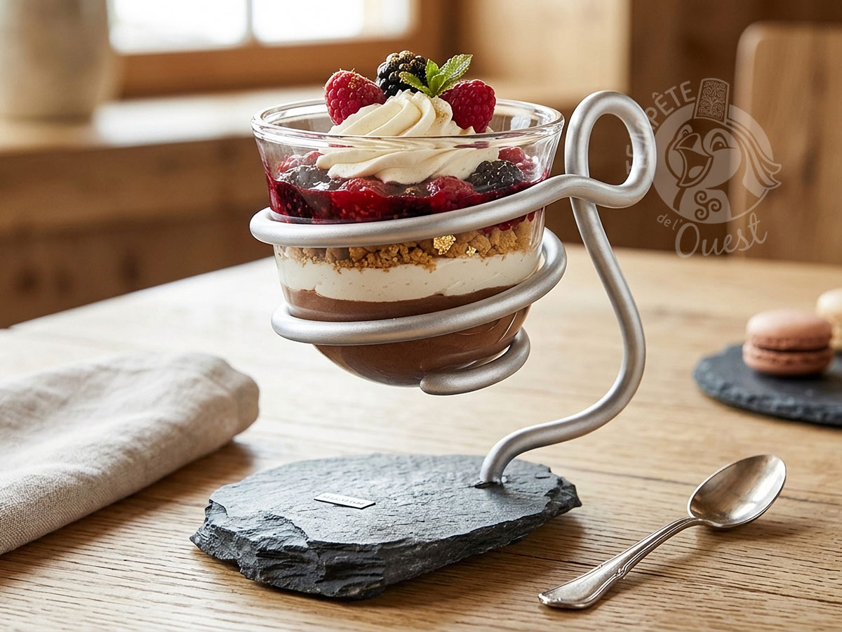 Fruit d’un ouvrage artisanal, entièrement confectionnée à la main en Bretagne dans le Finistère, la Flûte Celte est un article de vaisselle bretonne d’excellence, où la modernité se mêle à la féérie enchanteresse. Originellement réalisée sous la forme de flute à champagne, la Flûte Celte se décline aussi en verre de 16cl : sa contenance la rend idéale pour la dégustation d’alcools forts tels que du whisky, des liqueurs, spiritueux et digestifs, mais bien plus polyvalente, elle vous sera aussi utile pour servir le thé, le café ou en guise de verrine pour un dessert. Hors du temps et hors du commun, la Flûte Celte est constituée d’un socle tantôt en pierre naturelle ou en ardoise naturelle de Bretagne taillée main et d’une tige en métal entremêlée à la main également sur laquelle repose son verre en borosilicate double paroi : c’est une véritable oeuvre artisanale au sens propre du terme, sans aucun usage de technologique, qui s’invitera à votre table pour enchanter vos convives à l’heure de la dégustation de vos élixirs. Réalisées en petite série, chaque Flûte est ainsi complètement unique, aucune d’entre elle ne ressemblera à deux gouttes d’eau à sa voisine.