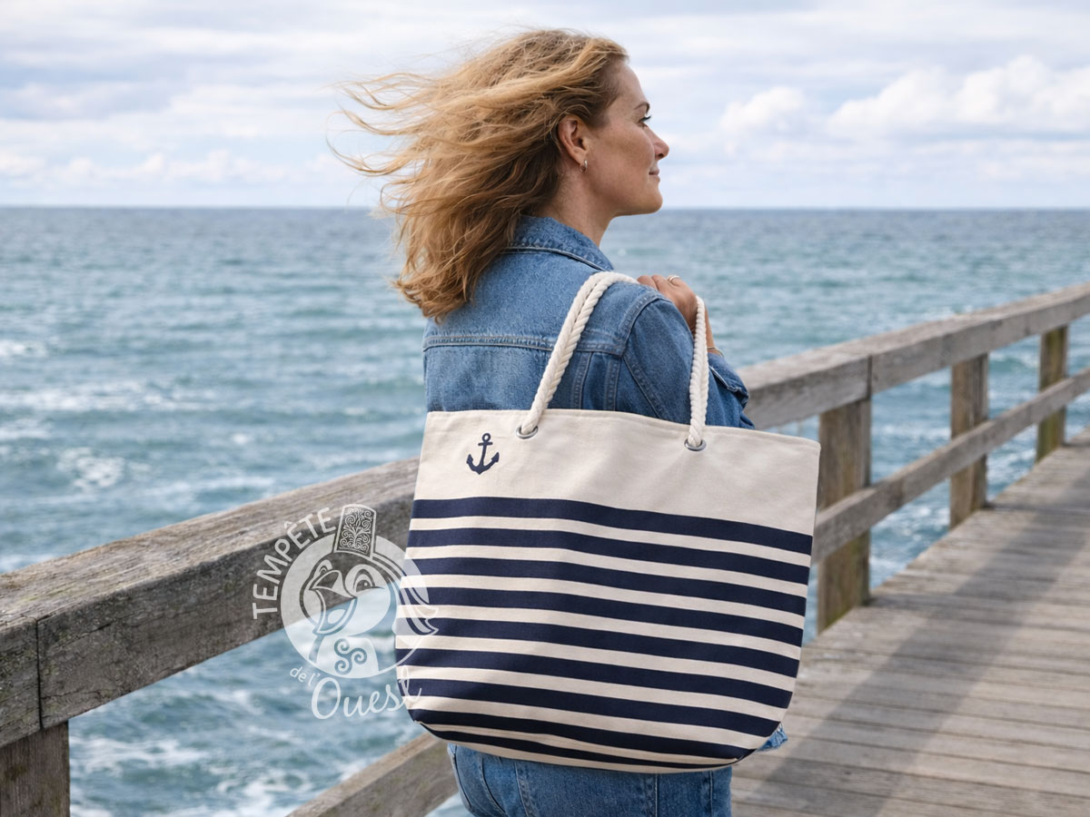 Pour aller à la plage ou partir en week-end, pavanez-vous avec ce grand sac chic et intemporel orné de rayures marinière bleu marine et d’une petite ancre en haut ! Equipée de deux grandes anses torsadées, vous pourrez le porter à l’épaule. Doté d’une fermeture zippée, il dispose d’une doublure de protection à l’intérieur et d’une poche de rangement simple pour y ranger vos clés ou votre téléphone. Sa contenance sera idéale pour l’utiliser comme cabas de plage ou sac fourre-tout.