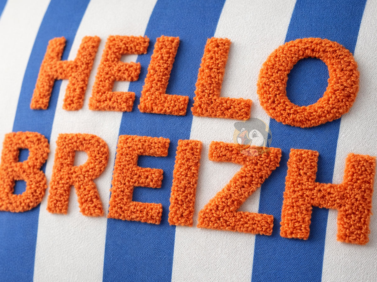 Apportez un souffle d’air marin et une touche de Bretagne à votre intérieur avec cette housse de coussin Hello Breizh. Directement inspirée de l’esprit côtier, elle arbore les indémodables rayures bleues et blanches pour un coussin marinière indémodable qui réveille instantanément un canapé ou un fauteuil un peu trop sage. Ce qui fait vraiment la différence, c’est son lettrage en relief bouclette orangé. Ce contraste de couleurs apporte de la modernité et un relief tactile agréable au toucher, parfait pour ceux qui cherchent un coussin décoratif breton qui sort des sentiers battus.