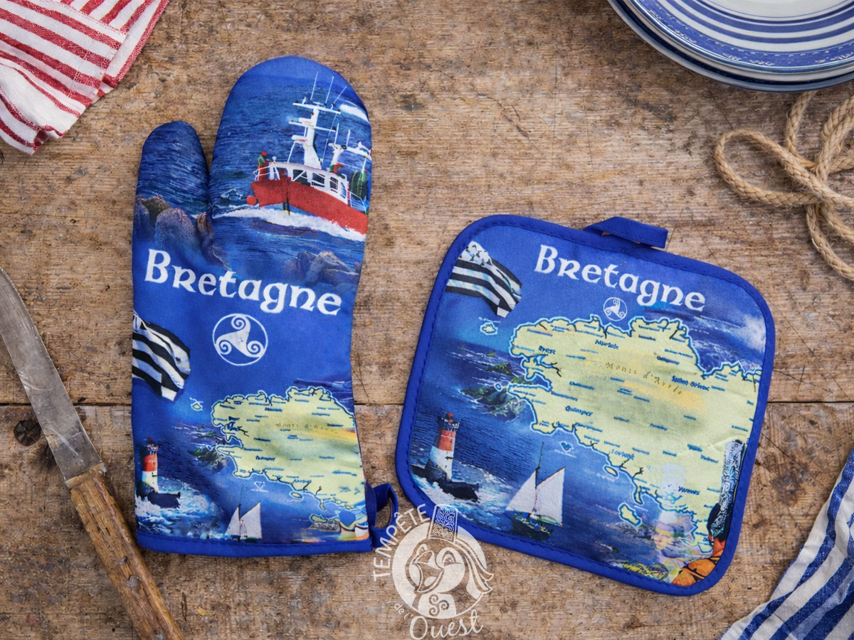 Ce lot de gant et manique Bretagne est un clin d’œil assumé à l’univers maritime breton : entre la carte de la région, le phare, le bateau de pêche, tout l’esprit de la côte s’invite dans votre cuisine !