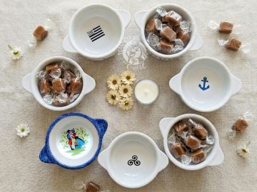Ces jolis petits bols bretons, version mini du célèbre bol à oreille de Bretagne, déclinés avec des ornements différents (le traditionnel couple de bretons, la version Bretagne avec ses triskell et hermines, la version marine avec son ancre, le drapeau breton…) pourront parfaitement faire l’objet d’un cadeau original aux invités de votre événement d’un jour (mariage, baptême, communion, etc.) en y glissant pourquoi pas, quelques petits caramels bretons à l’intérieur, ou être utilisés à votre table comme petit bol de sauce ou encore petit pot de beurre accompagné de son couteau à toastiner.