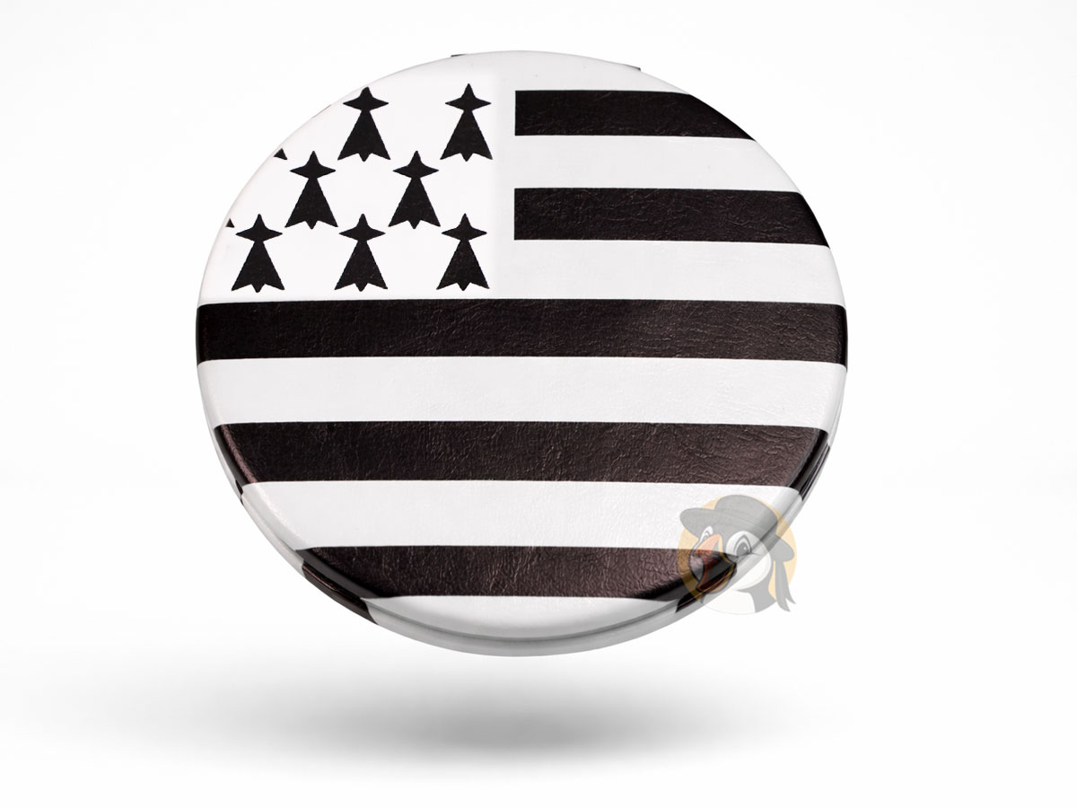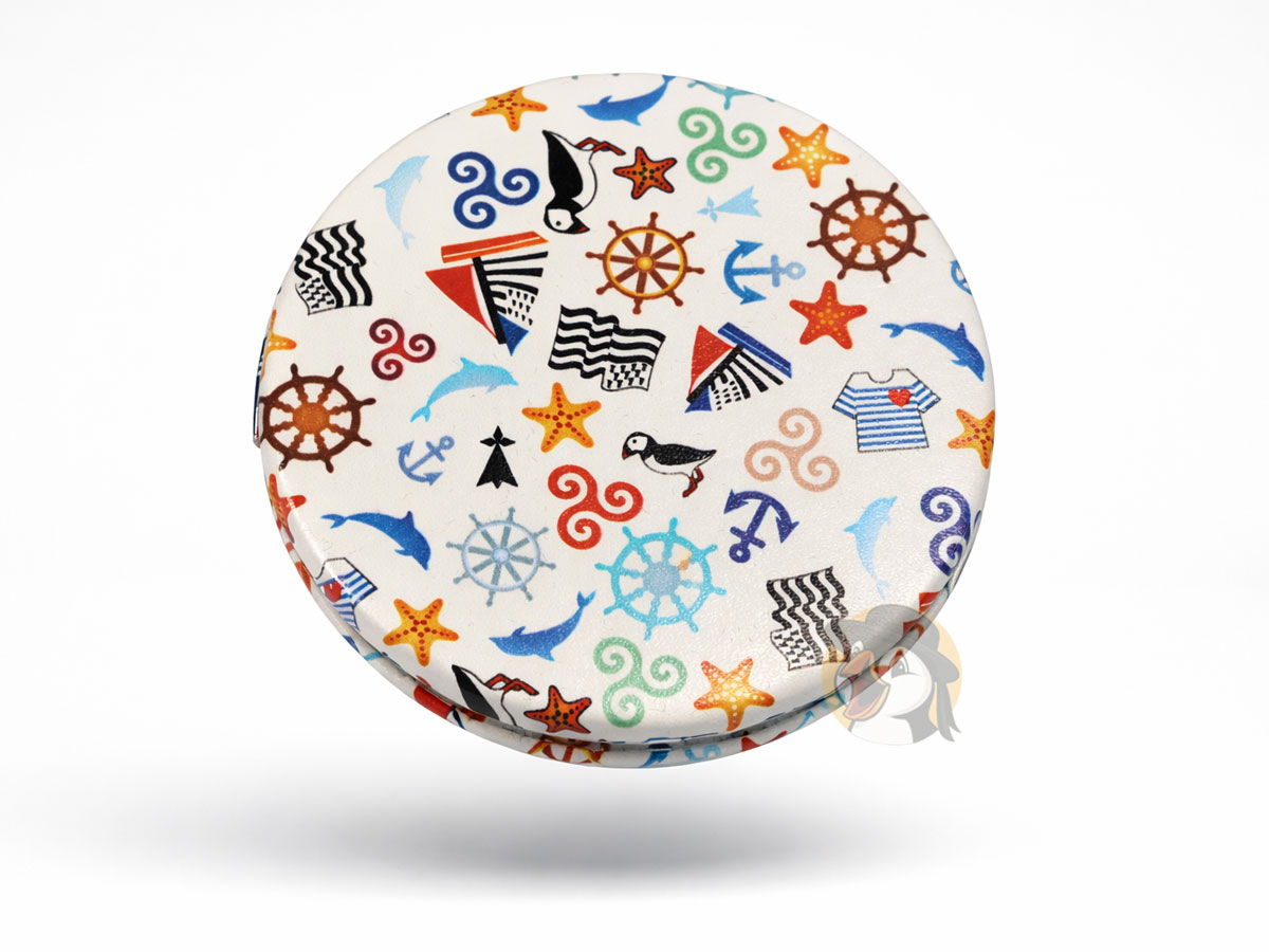 Pensés pour se glisser dans n’importe quel sac à main ou trousse de maquillage, ces miroirs de poche compacts arborent un fini en simili cuir texturé très agréable au toucher. Le décor, décliné sur les deux faces pour une finition soignée, se décline en quatre univers emblématiques : vous pouvez opter pour le célèbre drapeau breton, la force symbolique du triskell sur fond rouge, l’esprit marin d’une ancre sur marinière ou encore le joyeux pêle-mêle illustré regroupant symboles bretons et marins (macareux, triskell, hermines, voiliers, etc.)