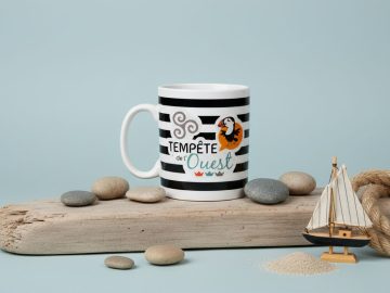 Entièrement décorée avec soin et imprimée avec une belle qualité de rendu, notre tasse bretonne Tempête de l’Ouest reprend tous les symboles qui font battre le cœur de notre univers breton : les rayures marinière intemporelles, notre adorable macareux moine, le triskell celte emblématique et nos trois petits bateaux en papier qui invitent à l’aventure ! Parfaite pour accompagner votre café du matin, votre thé réconfortant ou un bon chocolat chaud, ce mug breton ajoute instantanément une touche de bonne humeur et un parfum de grand large à vos pauses du quotidien.
