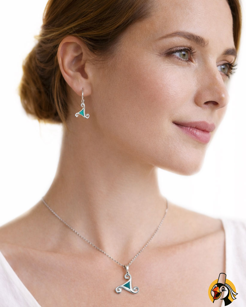 Il est conçu en argent massif 925, l’alliage de référence en bijouterie pour sa fiabilité et sa durabilité. Composé à 92,5 % d’argent pur, il offre une excellente tenue dans le temps tout en conservant la noblesse du métal. Le pendentif est poinçonné, garantissant l’authenticité de sa matière et le respect des standards de la joaillerie. L’argent 925 est également apprécié pour ses propriétés hypoallergéniques, ce qui le rend confortable à porter au quotidien. Le triskell est rehaussé d’une véritable pierre turquoise naturelle, choisie pour sa couleur et son caractère. À la différence des pierres synthétiques ou reconstituées, chaque turquoise présente des variations naturelles de teinte, rendant chaque pendentif unique. Son association avec l’argent crée un contraste élégant. Sur le plan symbolique, la turquoise est traditionnellement liée à l’apaisement et à l’harmonie intérieure.