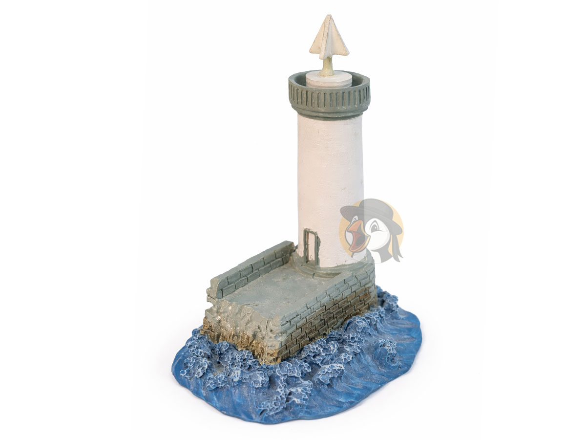 Cette miniature représente le fanal du môle vert de Camaret-sur-Mer, installé à l’extrémité de la digue qui protège le port. Sa silhouette simple, avec sa tour cylindrique directement posée sur la maçonnerie et sa flèche bien visible au sommet, correspond aux feux de jetée destinés à guider les navires lors de leur entrée au port.