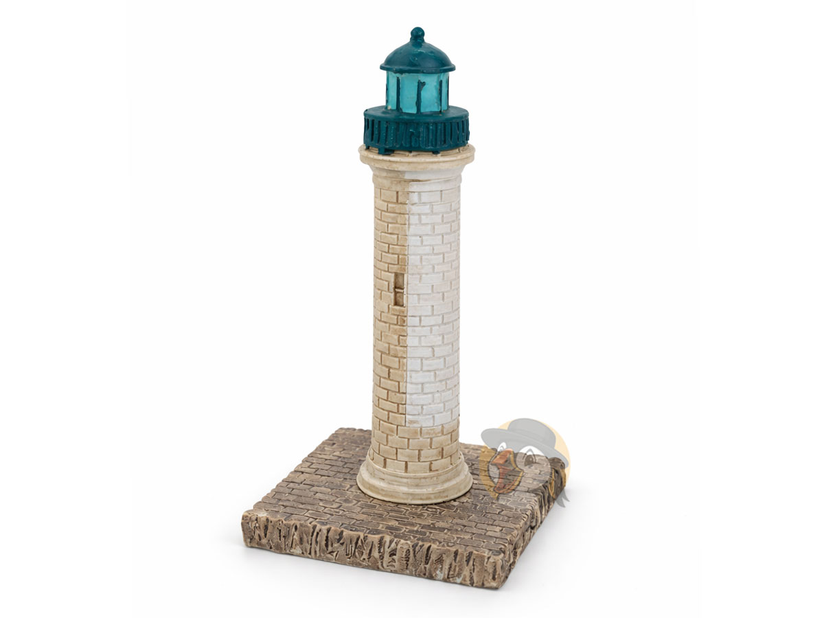 Cette reproduction reprend les éléments les plus reconnaissables du phare : la tour cylindrique en pierre claire, la porte verte en pied et la lanterne assortie au sommet. Posée sur une base texturée évoquant les pavés de la jetée, elle permet de retrouver immédiatement l’ambiance du port de Binic.