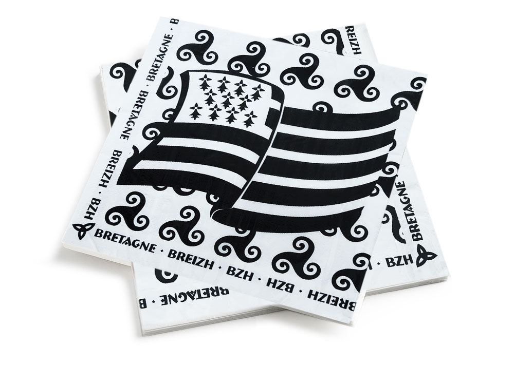 Ces serviettes en papier Breizh sont idéales pour apporter une petite touche bretonne à vos moments de convivialité. D’un côté, on retrouve le drapeau breton entouré de triskells et des mots « Bretagne – Breizh – BZH » qui rappellent fièrement nos racines. De l’autre, un motif tout en simplicité avec des triskells répétés sur fond blanc. Pratiques au quotidien comme lors de vos apéritifs, pique-niques ou repas de fête, elles allient l’utile à l’agréable et participent à créer une table à la fois accueillante et marquée par l’esprit breton.