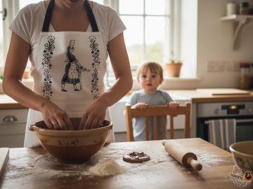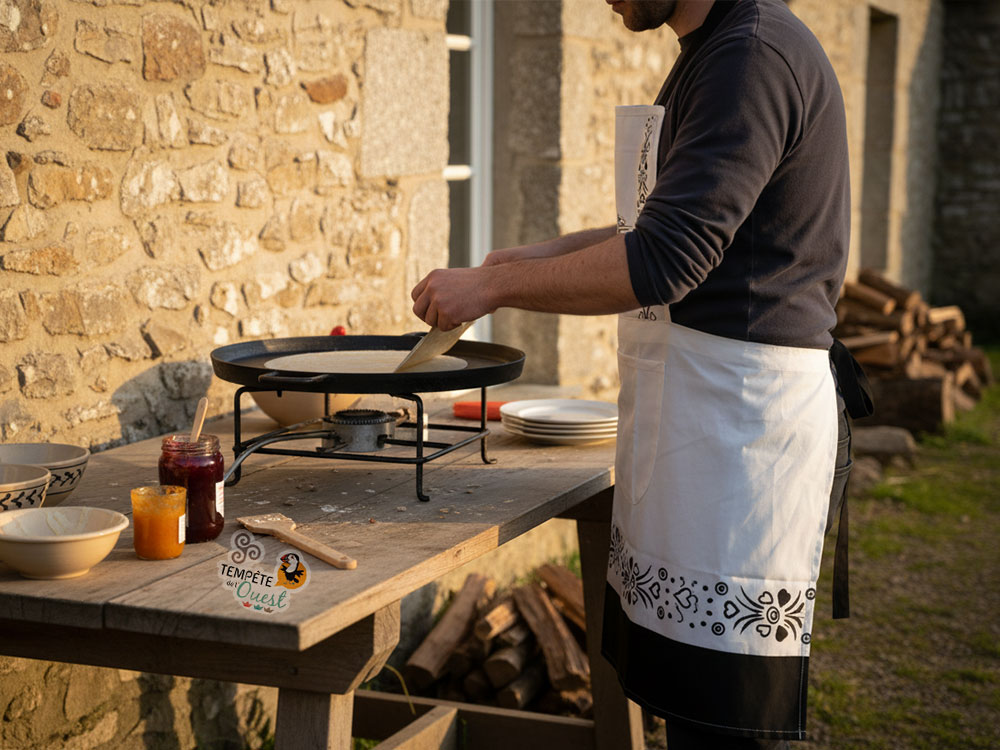 Un superbe tablier au charme intemporel, à mi-chemin entre le graphique et le rétro ! Avec son illustration centrale d’une Bigoudène en pleine préparation culinaire et ses motifs floraux stylisés noir sur blanc, il tombera à point nommé quand ce sera à votre tour de vous mettre derrière les fourneaux. Une coupe originale, avec sa large bavette haute structure joliment la silhouette tout en assurant une bonne protection. On aime particulièrement la grande poche frontale, pratique pour glisser torchon, ustensiles ou autre carnet de recettes. Pensé pour la cuisine du quotidien comme pour les grandes tablées du dimanche, ce tablier mêle esprit d’antan et modernité graphique. Il accompagnera avec fierté crêpières, kouign-amann maison ou festins iodés ! Il est doté d’une sangle réglable au niveau du cou et d’un lien à nouer autour de la taille.