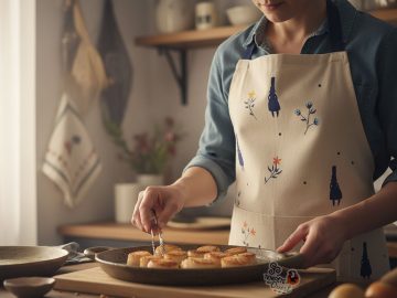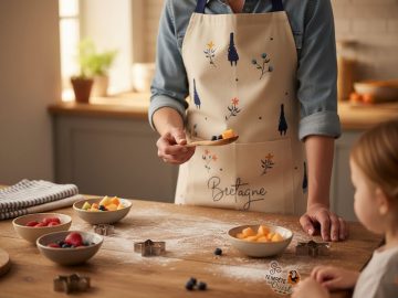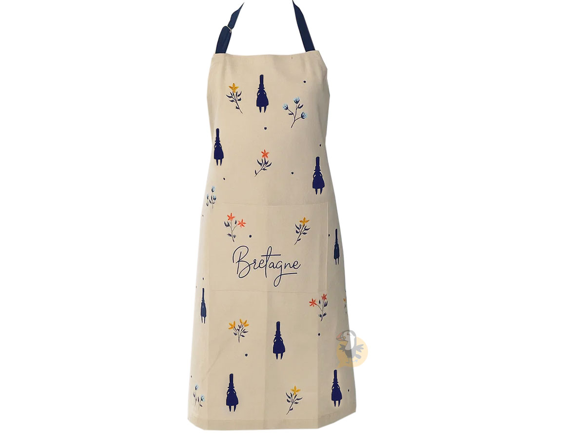 Apportez une touche de poésie à vos moments en cuisine avec ce joli tablier de cuisine orné de petites bigoudènes stylisées et de délicates fleurs colorées. Son tissu en coton de couleur sable, douce et chaleureuse, met en valeur les motifs bleu marine, rouge, jaune et bleu clair qui évoquent les landes fleuries et l’âme graphique de la Bretagne. Pratique et confortable, il couvre généreusement tout le buste et s’attache facilement autour du cou et de la taille. Sa grande poche frontale vous permet d’y glisser torchon, cuillère en bois ou recette en cours. Que vous mijotiez un kig ha farz ou une fournée de biscuits pur beurre, ce tablier vous accompagnera dans toutes vos aventures culinaires !