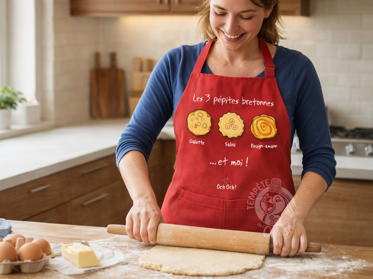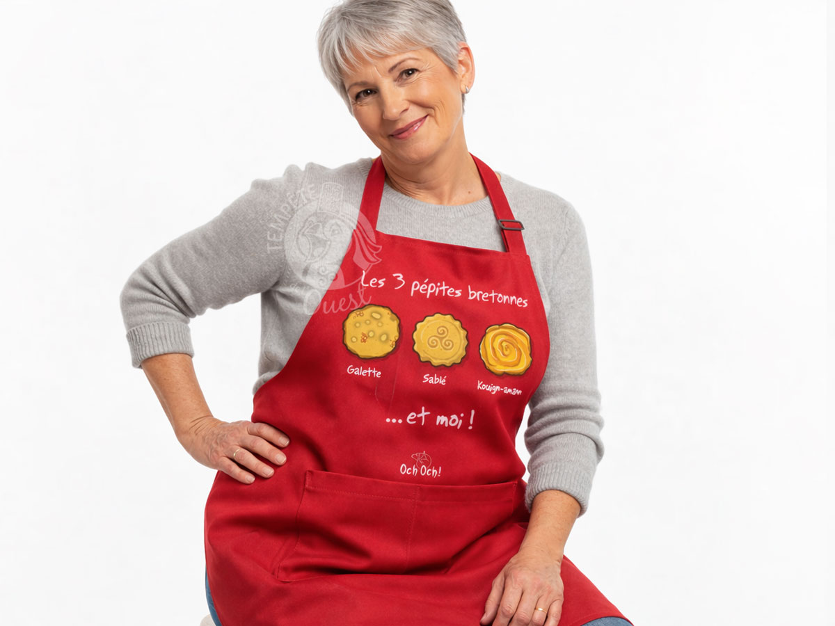 Avec ses “3 pépites bretonnes”, galette, sablé, kouign-amann… et vous bien sûr, ce tablier humoristique breton Oc’h Oc’h rouge vif joue la carte de l’autodérision gourmande et célèbre les délices bretons pur beurre !