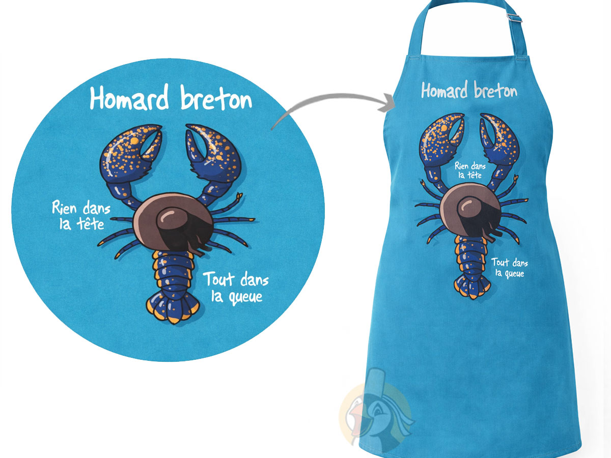 Un tablier qui annonce la couleur dès l’entrée en cuisine, avec un humour breton bien salé comme on l’aime : arborant un bleu océan éclatant, il met en scène le plus célèbre des crustacés armoricains, coiffé d’un chapeau breton traditionnel pour une touche d’autodérision typique de la région. Et avec son message caché, ce tablier Oc’h Oc’h ne manquera pas de provoquer une bonne tranche de rigolade ! Parfait pour les amateurs de bonne pitance, de second degré et d’apéros entre amis.