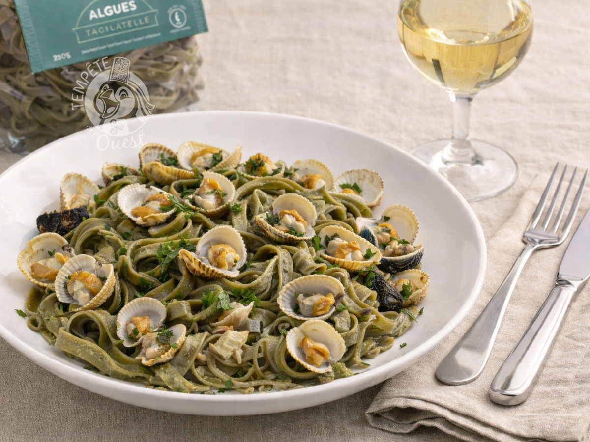Découvrez les pâtes bretonnes haute qualité de notre artisan pastier la Maison Hermine de Châteaubourg (35), locales, artisanales et à la hauteur de la réputation de la pasta italienne ! Et tout commence bien sûr par les ingrédients utilisés pour concevoir leur pâtes : du blé récolté en Bretagne, ensuite travaillé à la meule par un moulin en Bretagne pour obtenir le blé dur qui sera la clé de la réussite de ces pâtes. En somme, un processus de travail main dans la main avec divers acteurs locaux ! Et pour concevoir ces tagliatelles aux algues de Bretagne de leur gamme “Signature”, riche en antioxydants et en fibres grâce aux nombreux bienfaits santé de la laitue de mer, la Maison Hermine utilise des techniques ancestrales, que ce soit des moules en bronze ou un passage au laminoir pour les pâtes longues avec un séchage lent qui conserve tous les nutriments et la saveur des pâtes.