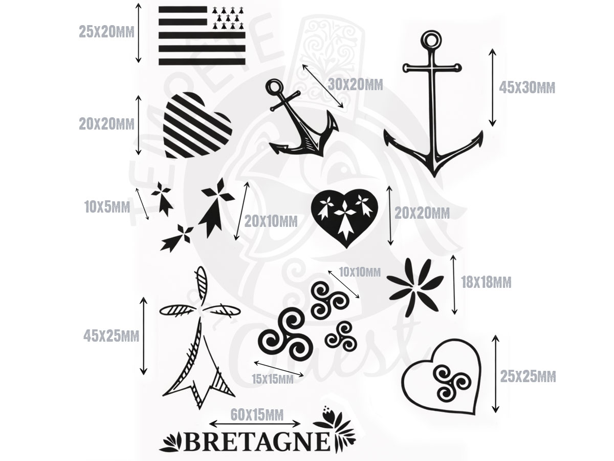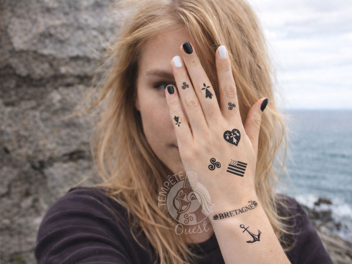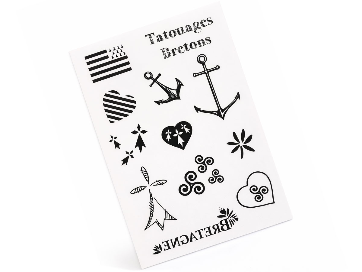 Ces tatouages bretons éphémères et temporaires sont pensés comme de petits clins d’œil graphiques à la Bretagne discrets et élégants : triskell, ancre marine, cœur breton, hermines, drapeau breton… chaque motif reprend un symbole breton phare.