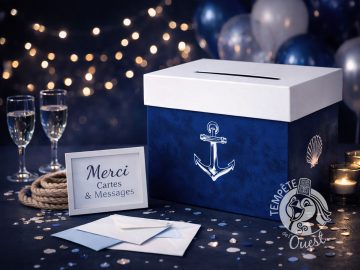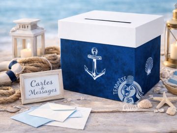 Cette magnifique urne pour mariage, baptême, anniversaire et autre évènement inoubliable sera, de par son décor marin, idéal pour vos cérémonies sur le thème de la mer. Avec une finition parfaite et une impression haute qualité, cette urne de fabrication 100% française accueillera étrennes et mots doux de vos convives d’un jour, qu’ils pourront glisser dans la fente située sur le couvercle. Son joli fond bleu marine ombré et ses symboles marins, coquillage et ancre, ainsi que son couvercle blanc, orneront avec élégance et sobriété votre salle de réception.