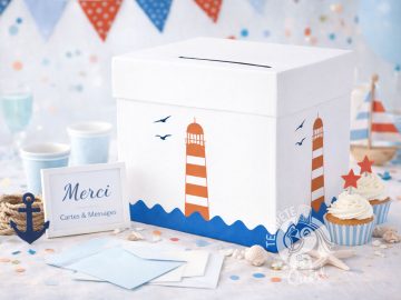 A disposer dans votre salle de réception, bien en évidence auprès d’un livre d’or et avec quelques décors autour pour attirer l’oeil, l’urne est un objet incontournable de toutes les grandes cérémonies telles qu’un mariage, un baptême, une communion ou un anniversaire. Cette boîte disposant d’une fente sur son couvercle permettra ainsi à vos invités d’y glisser un chèque, une enveloppe ou des mots doux à l’intérieur. Et si votre évènement a pour thème le monde maritime et l’océan, cette urne phare tombera a point nommé : sobrement décorée de vagues, d’un phare et de mouettes sur chaque face, cette création 100% française dispose d’une superbe qualité d’impression, avec un décor épuré qui conviendra à tous type de cérémonie.
