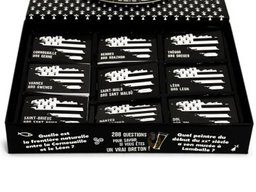 Ambiance conviviale, binouze à la main et fous rires garantis : voici de quoi pimenter vos apéros avec un jeu aussi breton qu’un kouign-amann au beurre salé. Yec’hed mat !, c’est le quiz régionaliste décomplexé qui vous entraîne aux quatre coins de la Bretagne historique, de Nantes à Brest, en passant par Guingamp, Rennes, Quimper ou Saint-Malo. Un voyage en 288 questions pour tester votre bretonnitude dans la bonne humeur et sans prise de tête. Le principe est simple : on fait tourner la roue, on tombe sur l’un des 9 anciens évêchés bretons et on pioche une question parmi un tas de thèmes: géographie, musique, gastronomie, sport, culture, cinéma…